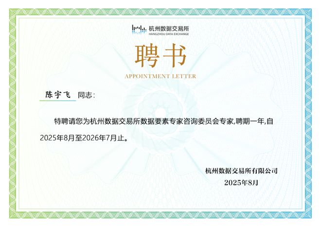喜报!融象集团董事长陈宇飞获聘杭州数据交易所“咨询委员会专家”
